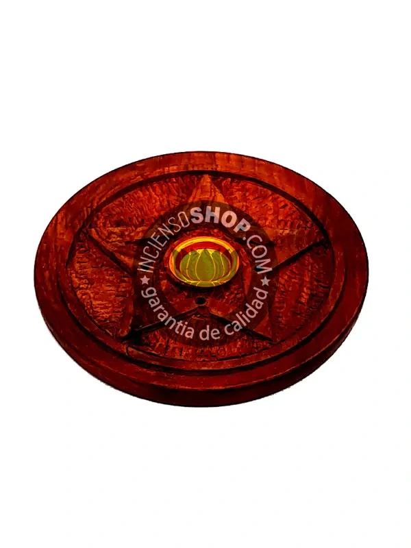Bandeja circular quemador porta incienso y conos de madera natural de mango, con motivo de estrella de cinco puntas. Ideal para quemar varillas y conos de incienso de forma segura y para evitar quemaduras en las superficies y recoger la ceniza del incienso al caer.