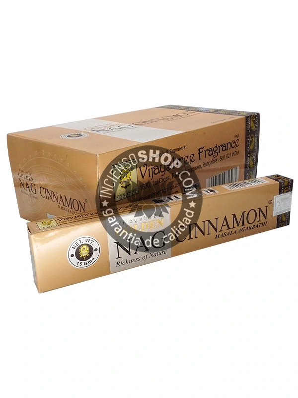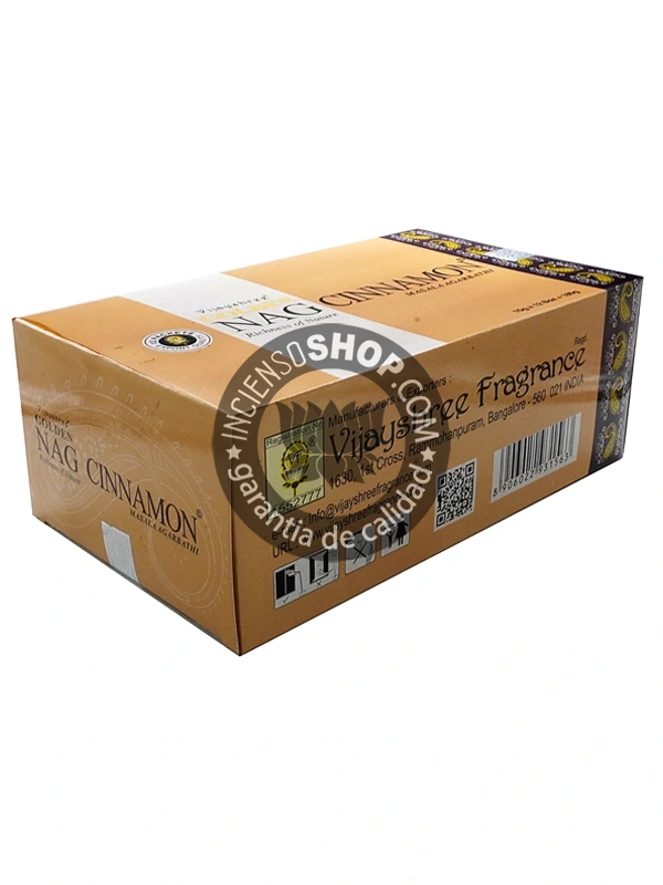 Características, propiedades y beneficios del incienso Golden Nag Cinnamon de Vijayshree en caja de 12uds