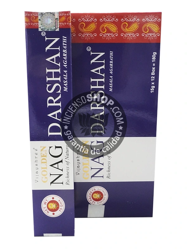 Características principales del incienso Golden Nag Darshan de Vijayshree en caja de 12 uds