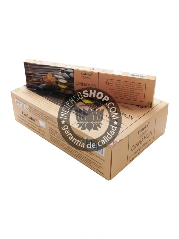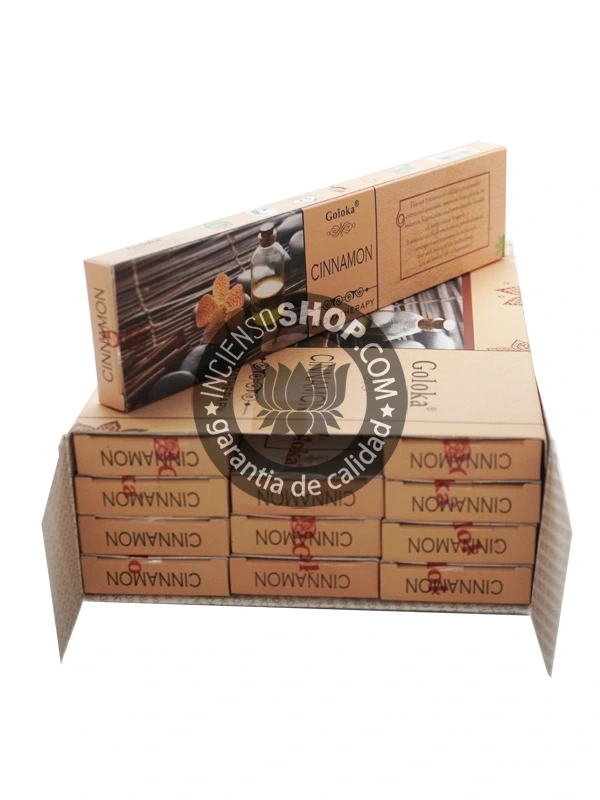 El incienso de canela de Goloka viene presentado en cajas de 12 unidades, cada una con 15 gramos y contiene entre 10 y 12 varillas por caja. Cada varilla tiene una duración aproximada de entre 45 y 60 minutos.
