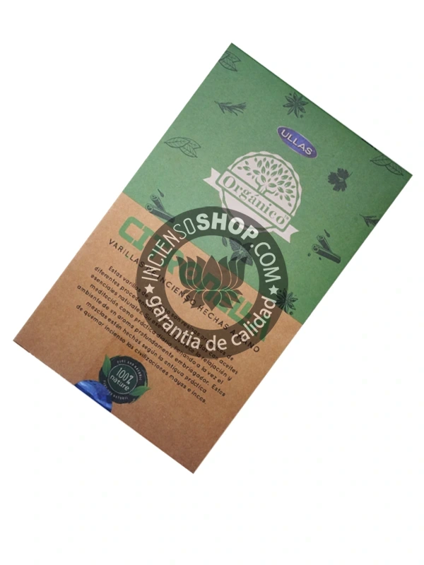 caja-incienso-ullas-citronella-portada-copiaIncienso de Citronella organico de Ullas Agarbatti Masala hecho a mano en caja 12 uds de 25g