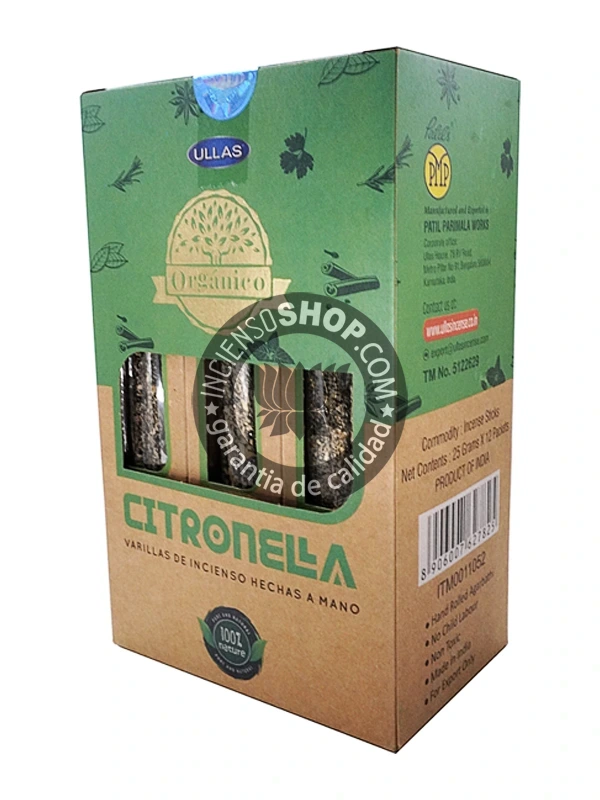 Incienso de Citronella organico de Ullas Agarbatti Masala hecho a mano en caja 12 uds de 25g