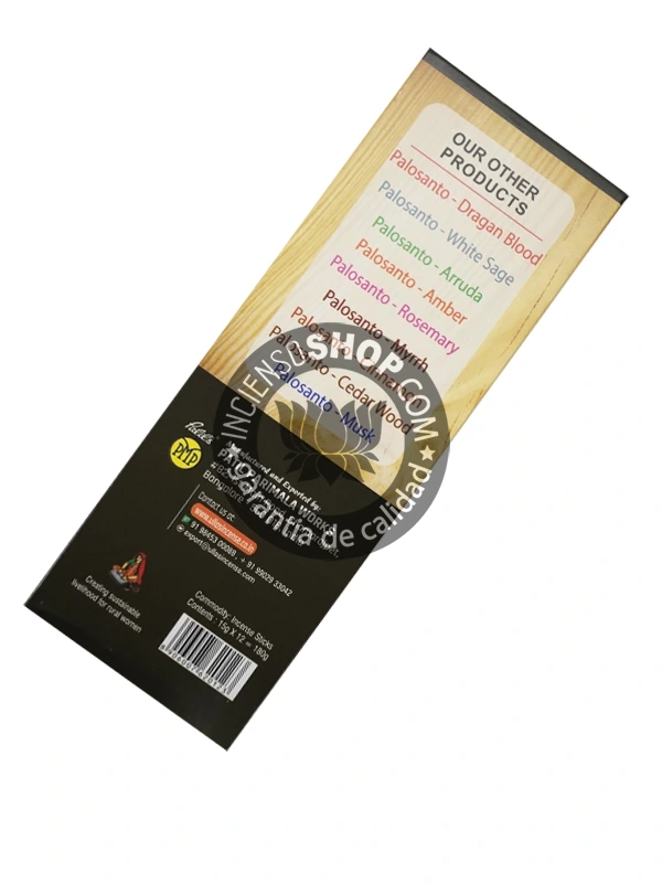 Presentado en cajas que contienen 12 unidades de 15 gramos, cada una con entre 10 y 14 varillas de incienso. Tiene una duración prolongada de entre 30-45 minutos por varilla. Las varillas de incienso deben prenderse con precaución, como explicamos en este enlace.